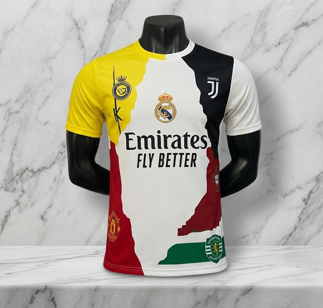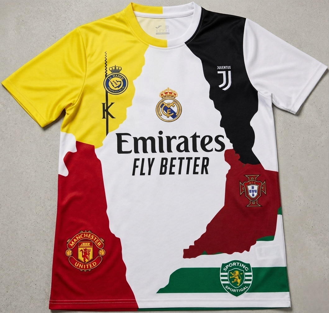 تيشيرت استثنائي مستوحى من مسيرة الأسطورة Cristiano Ronaldo، بيجمع ألوان وأندية صنعت تاريخ واحد من أعظم لاعبي كرة القدم. تصميم جريء ومميز يعكس رحلته بين أكبر الأندية العالمية في قطعة واحدة فريدة.