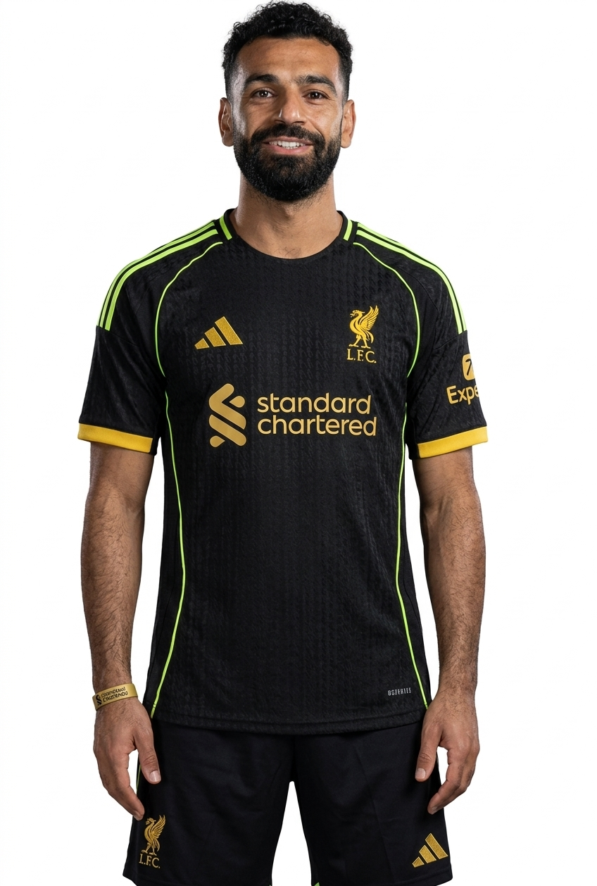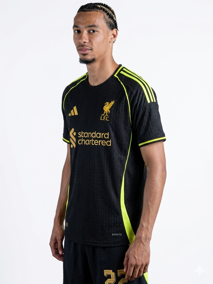 تيشيرت Liverpool FC الثالث 2025 بيقدّم ستايل فخم وجريء باللون الأسود مع تفاصيل ذهبية مميزة 🖤✨
